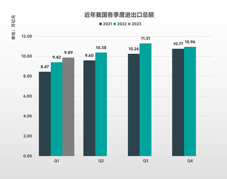 2021年Q1-2023年Q1,我国各季度进出口额分别为:8.47、9.6、10.26、10.77;9.42、10.38、11.31、10.96;9.89万亿元。从中不难发现两个趋势: