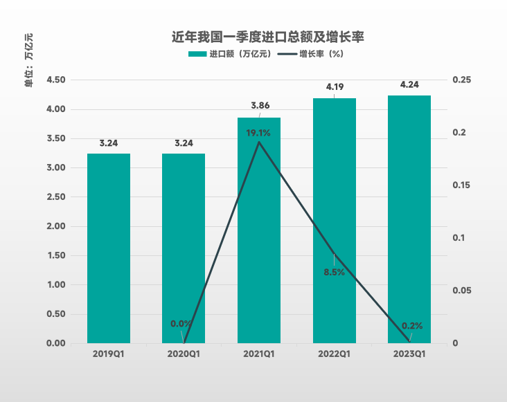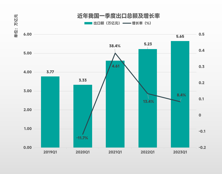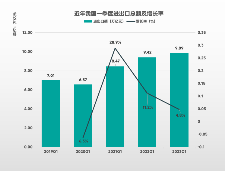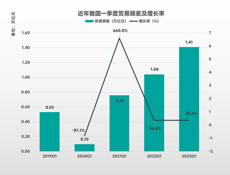 2023年一季度我国进出口贸易总额为9.89万亿元人民币,同比增长4.8%。其中,出口5.65万亿元,增长8.4%;进口4.24万亿元,增长0.2%。贸易顺差1.41万亿元。
