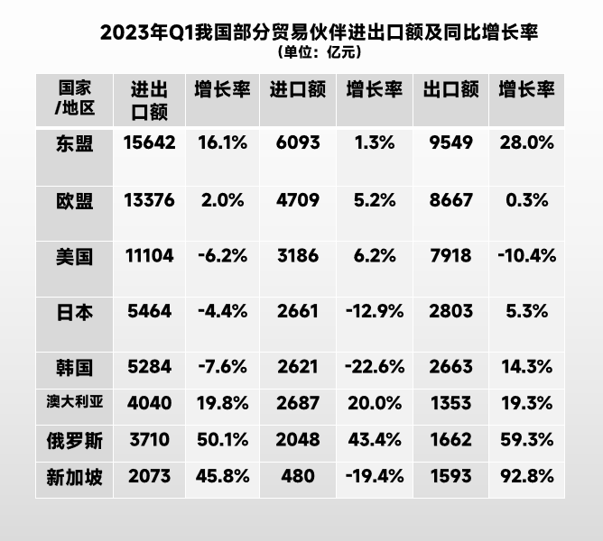 从今年一季度我国与部分贸易伙伴的进出口额及同比增长率来看,我国外贸市场正悄然经历着一场变局:其一,东盟在我国外贸市场中继续保持首位,且与其后的欧盟、美国差距进一步拉大;其二,俄罗斯、新加坡、澳大利亚等国家与我国贸易往来愈发密切,若保持现有增速极有可能赶超日韩地位;其三,美日韩三国作为我国长久以来的重要贸易伙伴,一季度与我国贸易额纷纷下降,特别是美国方面的缩减已持续8个月。而以上关于我国外贸市场主要合作伙伴的变化,显然有着更深层的大国间政治、经济博弈。